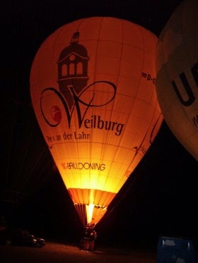 Anlässlich der 50-jährigen Städtepartnerschaft zwischen Braunfels (Lahn-Dill-Kreis) und Bagnols sur Cêze (F) fand am 22. Mai 2009 ein Fest auf dem Segelfluggelände von Braunfels statt. Der BSCN war mit zwei Ballonteams angereist um dort zu starten. Leider machte der bis zum Sonnenuntergang sehr starke, böige Wind da nicht mit. Als jedoch mit Einbruch der Dunkelheit der Wind nachließ, war die Entscheidung für ein Nightglow schnell gefallen. Unter der Regie von unserem Clubmitglied Uwe Lindlahr leuchteten die Ballone im Takt der Musik. |