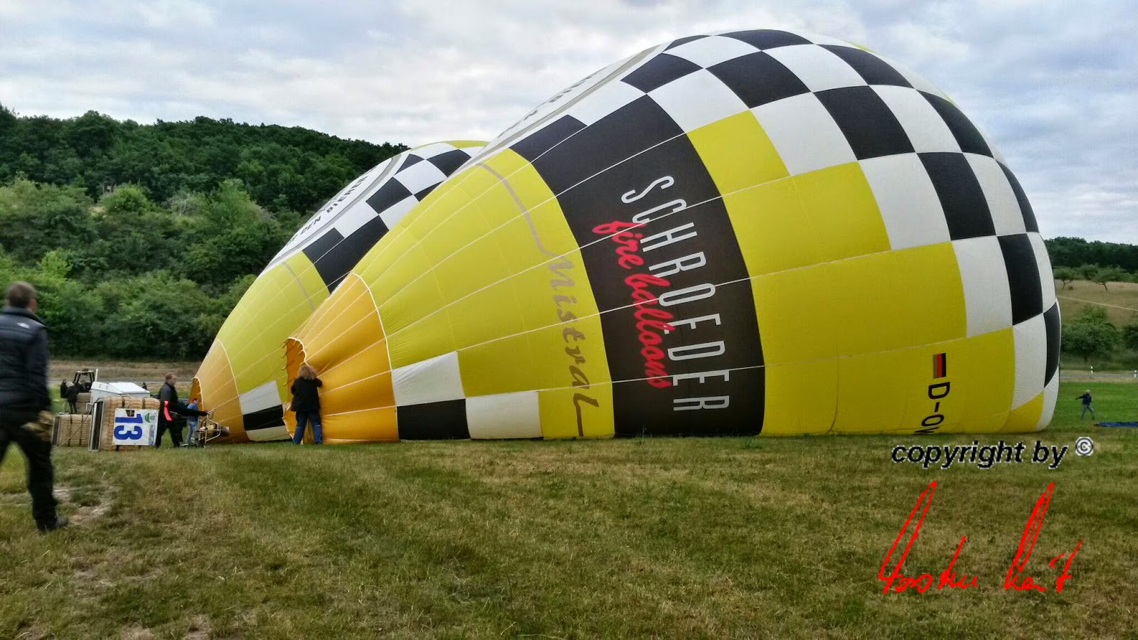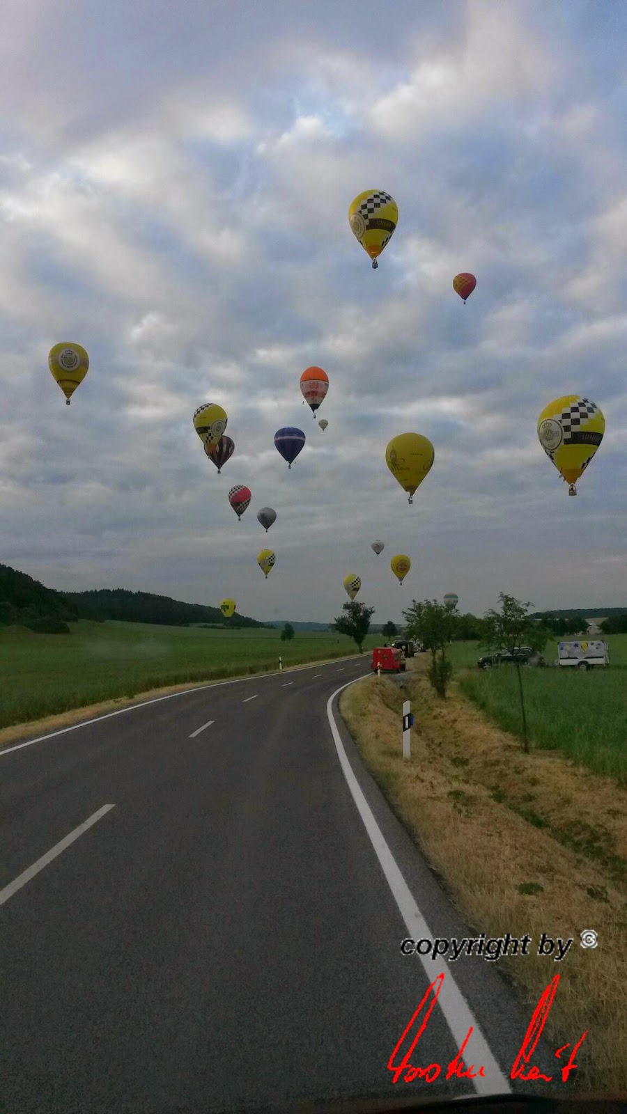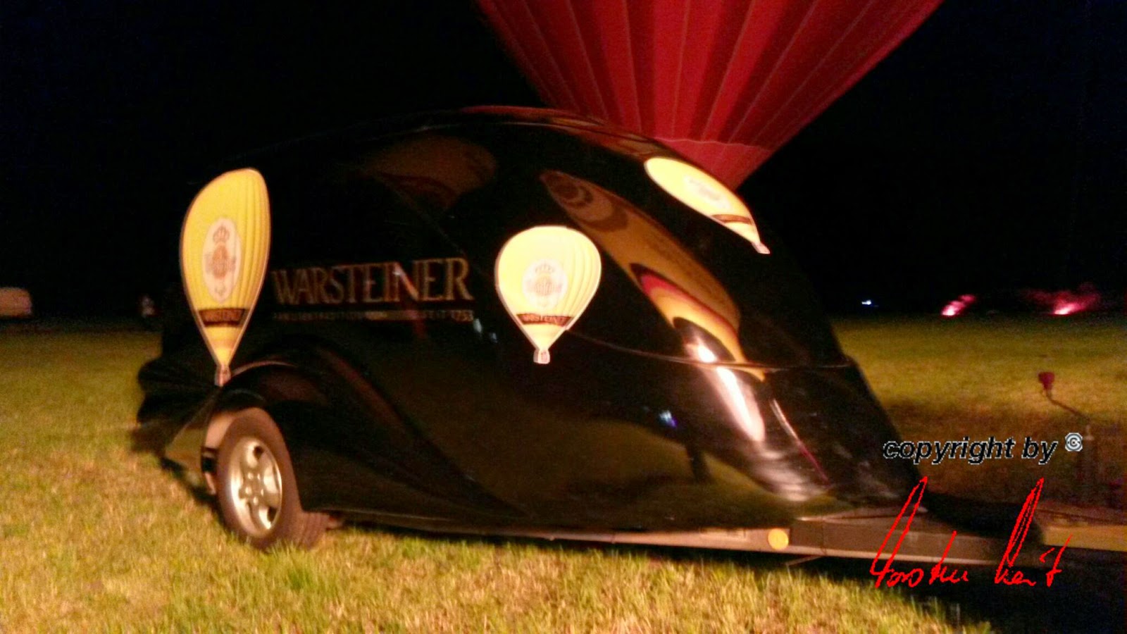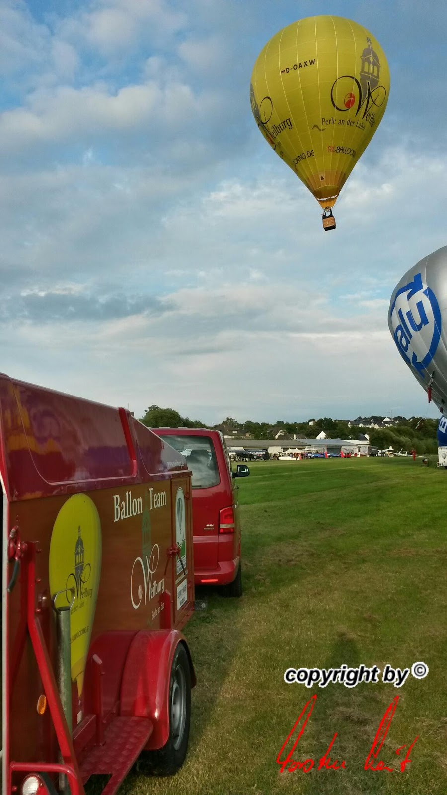 Freitag, 20. Juni 2014 / 1. Fahrt Leider ist noch bis in den späten Abend mit starken Böen zu rechnen, sodass die Fahrt immer noch abgesagt werden kann. Wir hoffen aber trotzdem auf einen Start und haben unseren Ballon bereits startklar im Anhänger, um schnell aufrüsten zu können. |