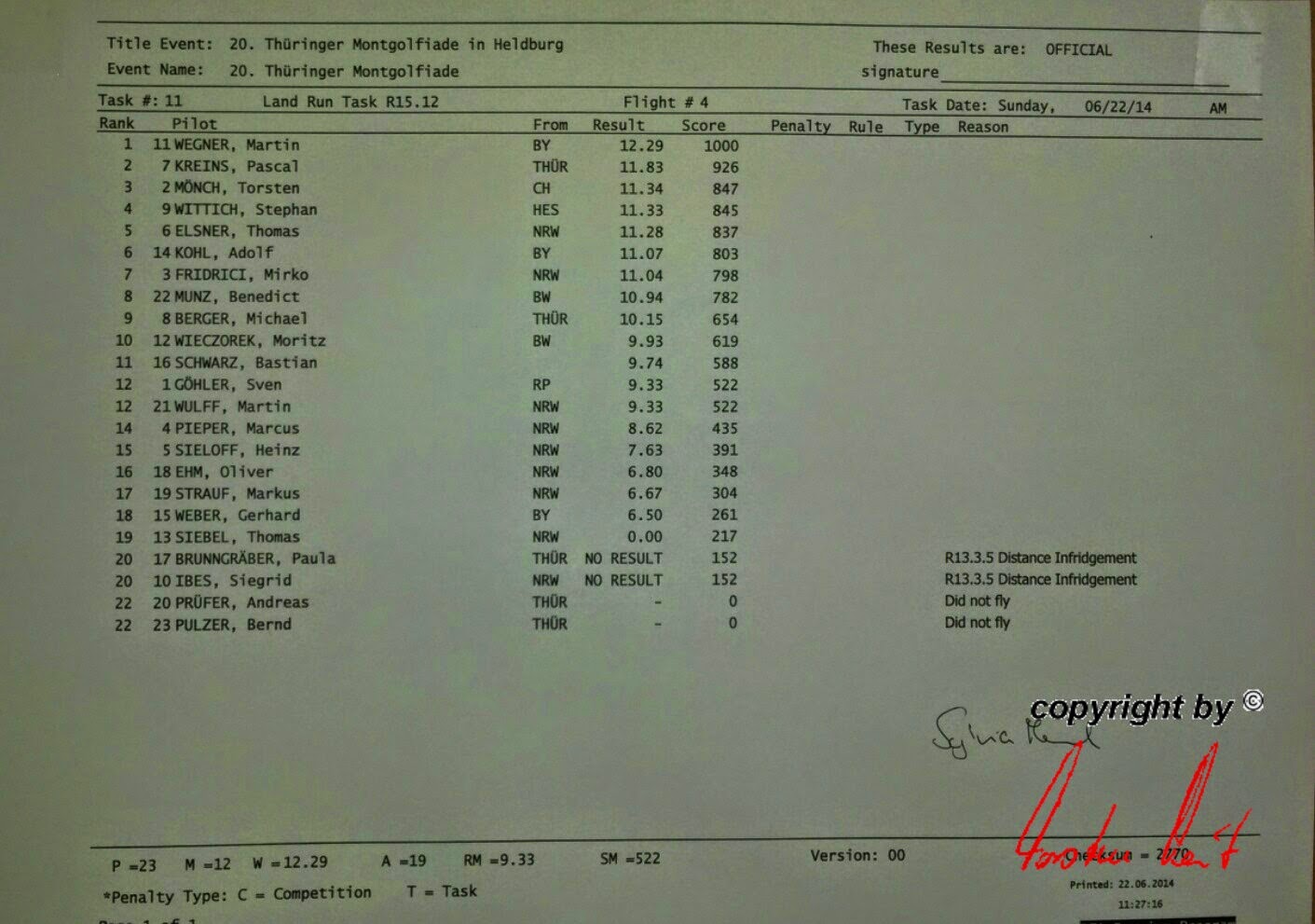 Freitag, 20. Juni 2014 / 1. Fahrt - Ergebnis Wunderbar, mit dem Ergebnis sind wir noch recht zufrieden. Eine Sekunde vor Ende der Wertungsperiode hat Marcus noch die Logger-Taste gedrückt und mit einem Abstand von 215 Metern zum Ziel immerhin noch 478 wertvolle Punkte holen können. |