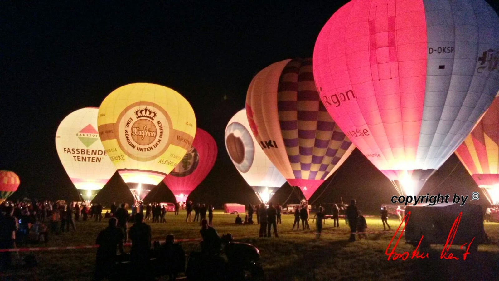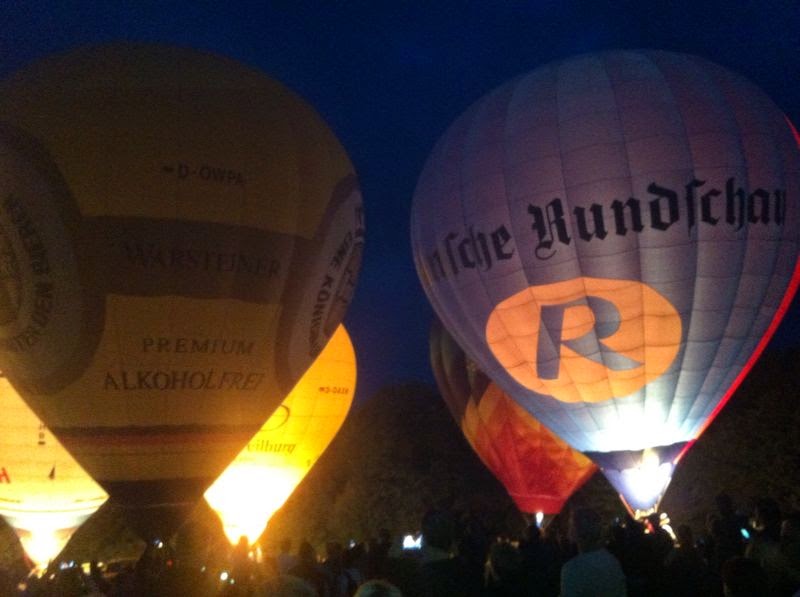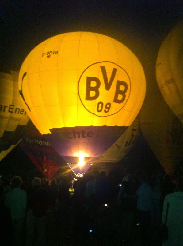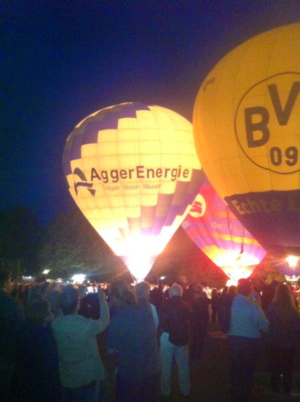 Das Wetter war mal wieder der große Unsicherheitsfaktor beim diesjährigen Lichterfest. Wir mussten mit dem Aufrüsten der Ballone aufgrund der starken Böen, die immer wieder rein kamen, bis ca. 22 Uhr warten - doch dann fiel die Entscheidung und die Ballone "AggerEnergie", "Warsteiner Alkoholfrei" und "Weilburg, Perle an der Lahn" des Ballonsport-Club Nümbrechts sowie die Ballone unserer befreundeten Piloten mit dem "BVB, echt Liebe", "Firefly", "Zunft", "Sparkasse der Homburgischen Gemeinden" und "Kölnische Rundschau / Sparkasse" wurden innerhalb kürzester Zeit aufgerüstet. Um 22:20 Uhr konnte dann das vom Publikum sehnsüchtig erwartete Nightglow beginnen. |