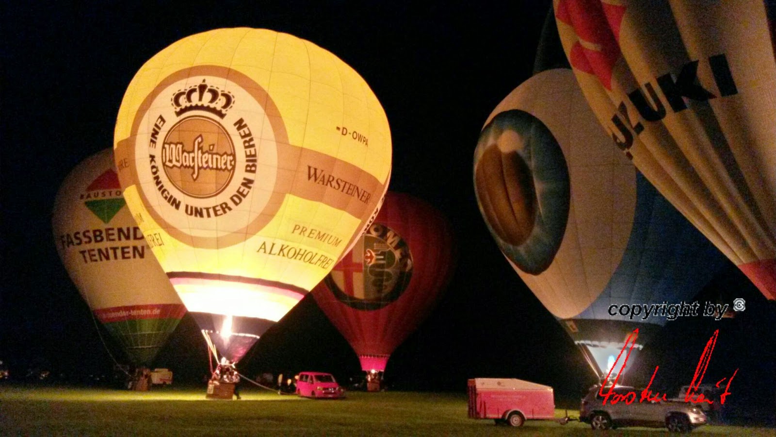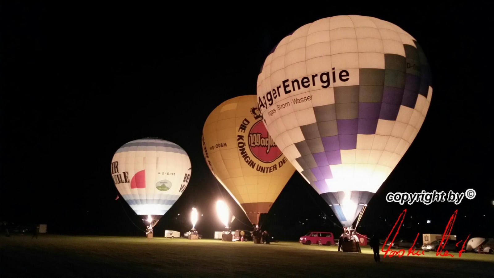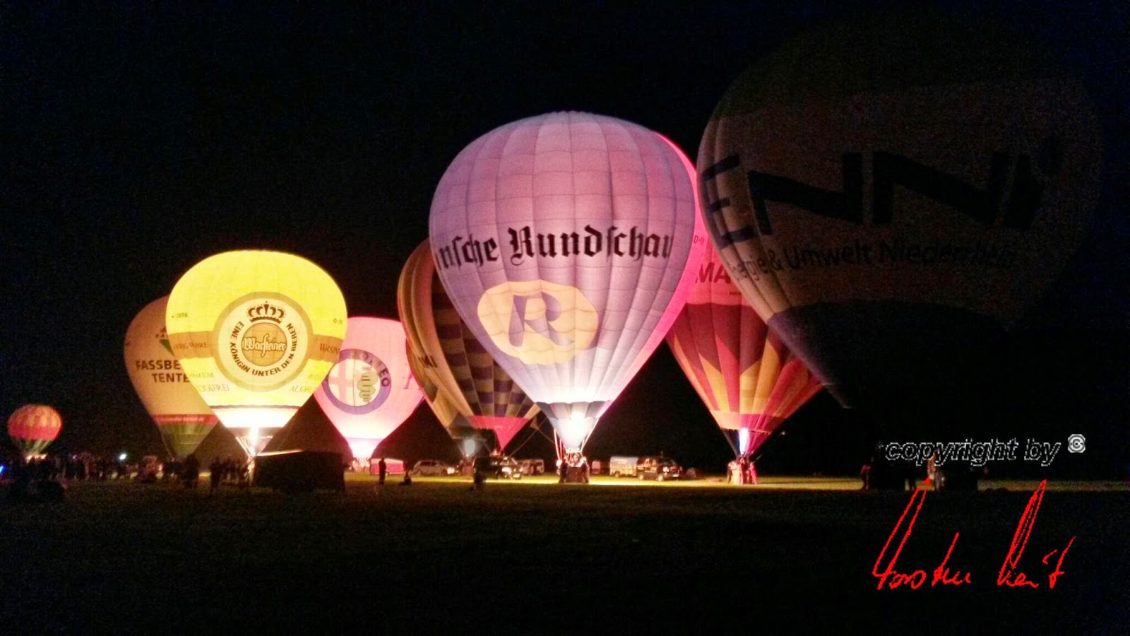Das Wetter war mal wieder der große Unsicherheitsfaktor beim diesjährigen Lichterfest. Wir mussten mit dem Aufrüsten der Ballone aufgrund der starken Böen, die immer wieder rein kamen, bis ca. 22 Uhr warten - doch dann fiel die Entscheidung und die Ballone "AggerEnergie", "Warsteiner Alkoholfrei" und "Weilburg, Perle an der Lahn" des Ballonsport-Club Nümbrechts sowie die Ballone unserer befreundeten Piloten mit dem "BVB, echt Liebe", "Firefly", "Zunft", "Sparkasse der Homburgischen Gemeinden" und "Kölnische Rundschau / Sparkasse" wurden innerhalb kürzester Zeit aufgerüstet. Um 22:20 Uhr konnte dann das vom Publikum sehnsüchtig erwartete Nightglow beginnen. |