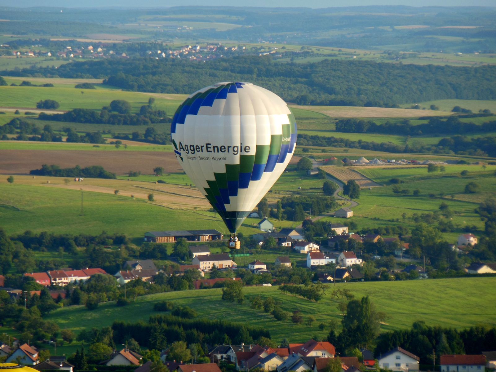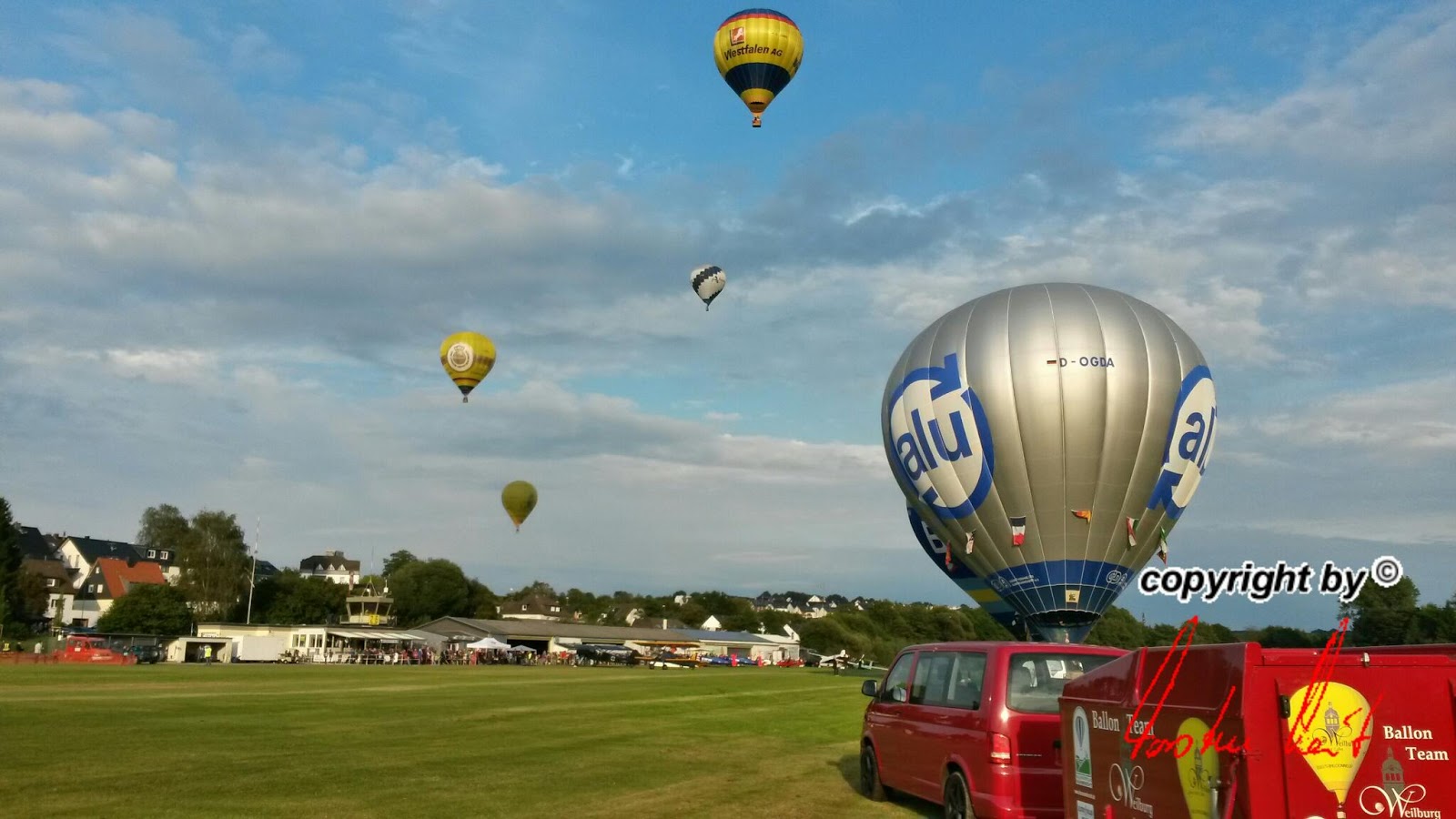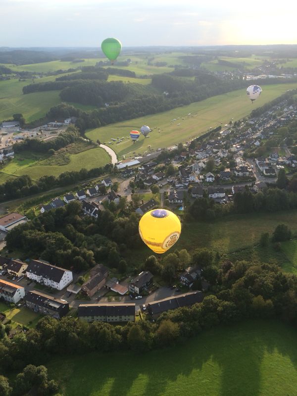 Anlässlich des Flugplatzfestes in Hünsborn sind wir am Sonntag, den 15. Juni bei herrlichem Wetter mit unsrem AggerEnergie-Ballon zusammen mit 7 weiteren Ballonen gestartet. Die Fahrt ging bis nach Mörsbach im Westerwald. |