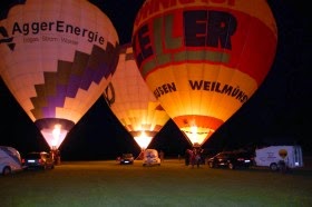 Anlässlich der 50-jährigen Städtepartnerschaft zwischen Braunfels (Lahn-Dill-Kreis) und Bagnols sur Cêze (F) fand am 22. Mai 2009 ein Fest auf dem Segelfluggelände von Braunfels statt. Der BSCN war mit zwei Ballonteams angereist um dort zu starten. Leider machte der bis zum Sonnenuntergang sehr starke, böige Wind da nicht mit. Als jedoch mit Einbruch der Dunkelheit der Wind nachließ, war die Entscheidung für ein Nightglow schnell gefallen. Unter der Regie von unserem Clubmitglied Uwe Lindlahr leuchteten die Ballone im Takt der Musik. |