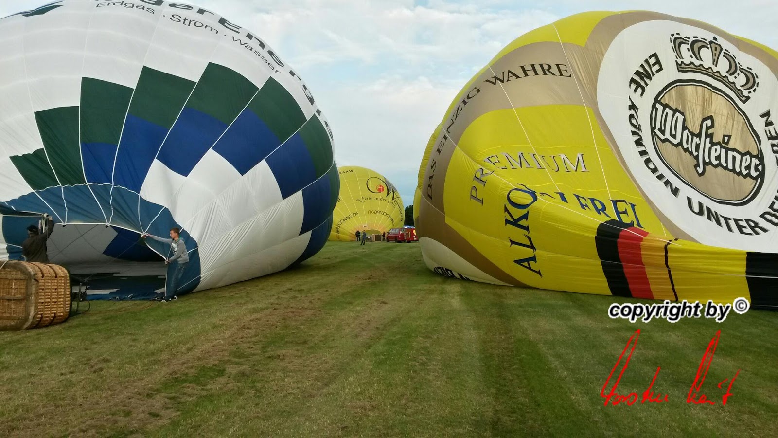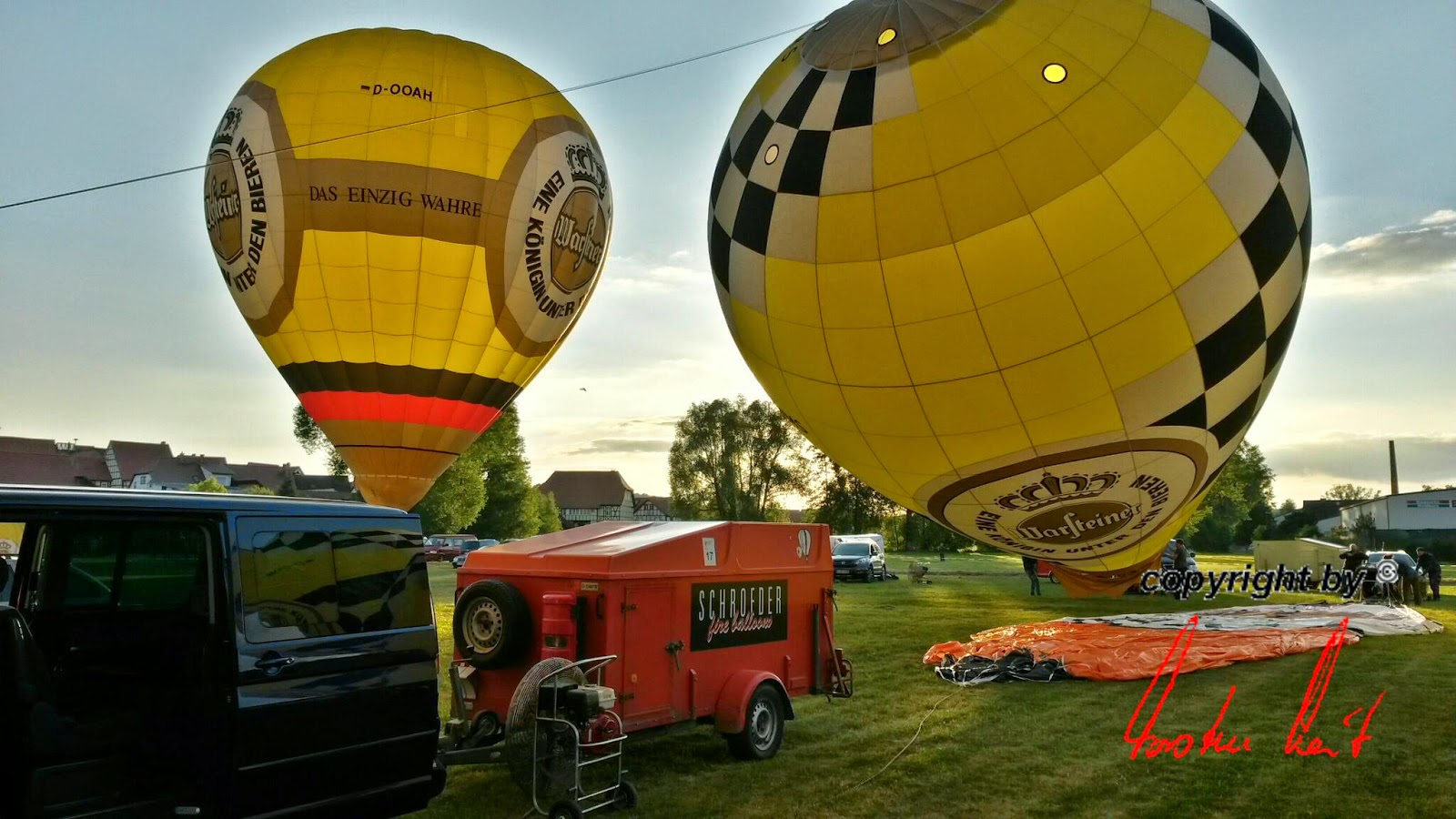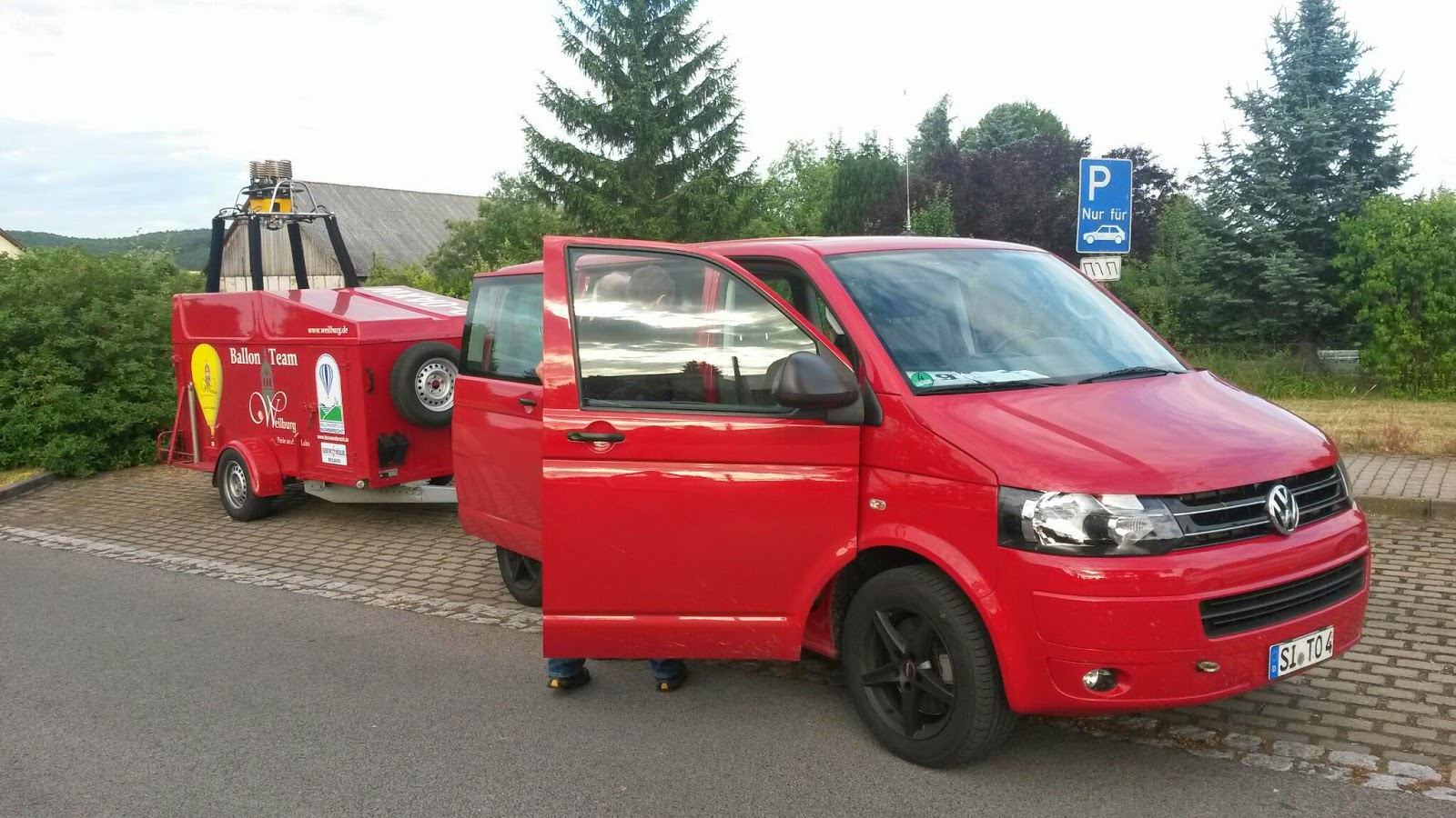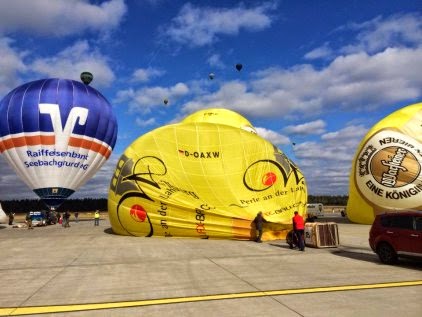 Freitag, 20. Juni 2014 / 1. Fahrt Leider ist noch bis in den späten Abend mit starken Böen zu rechnen, sodass die Fahrt immer noch abgesagt werden kann. Wir hoffen aber trotzdem auf einen Start und haben unseren Ballon bereits startklar im Anhänger, um schnell aufrüsten zu können. |