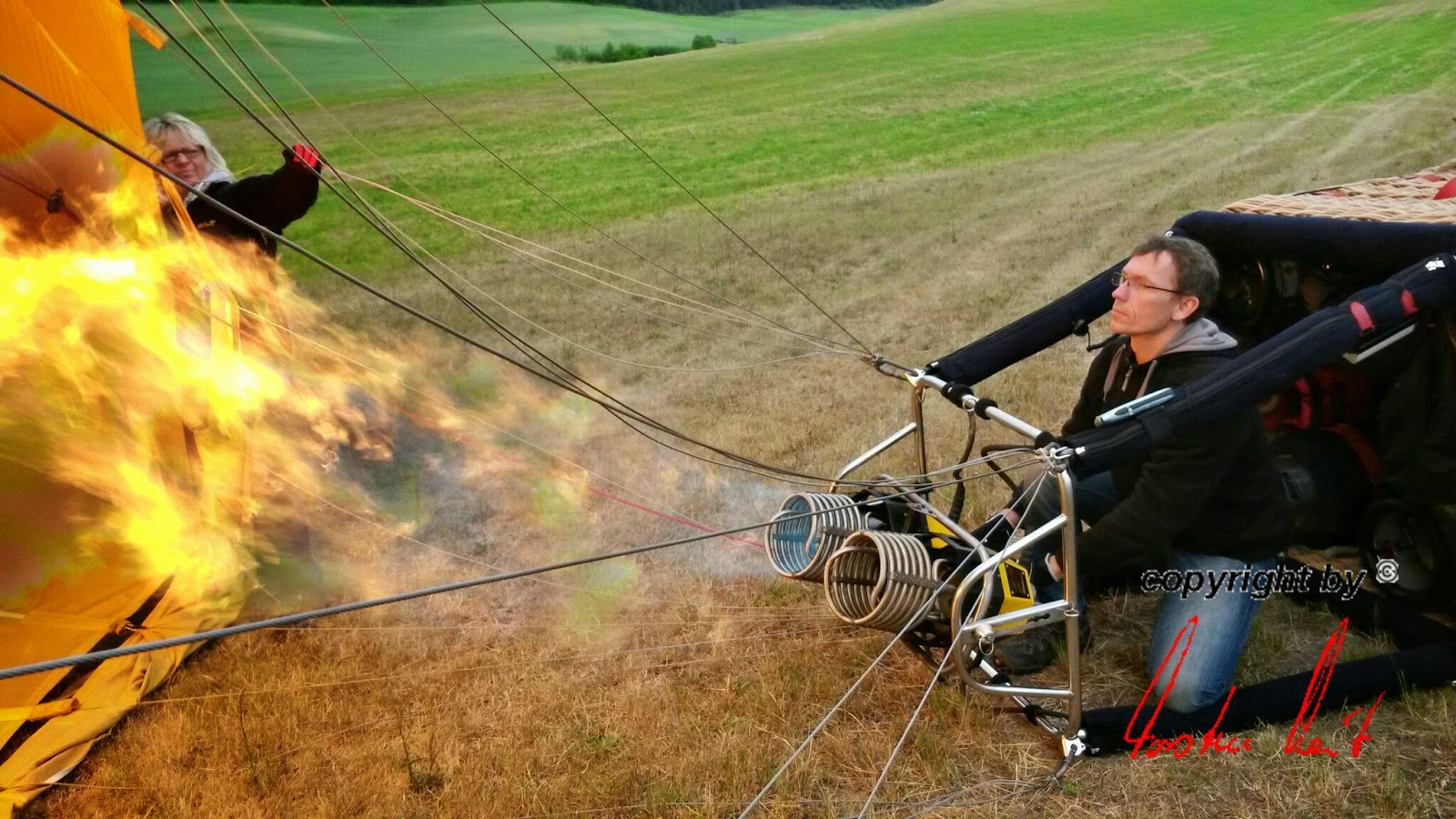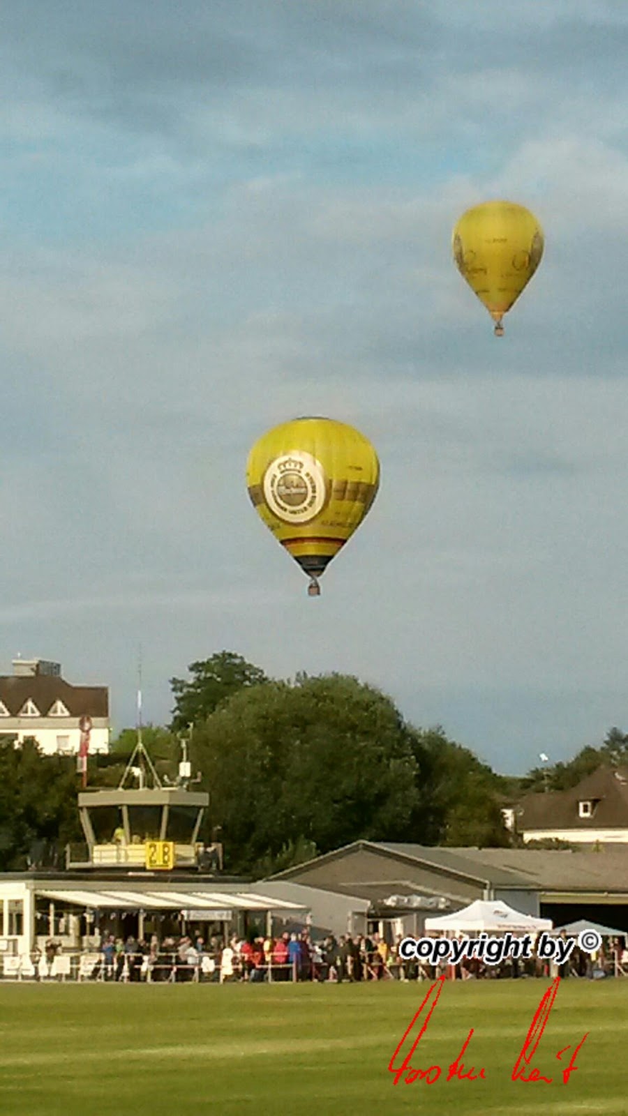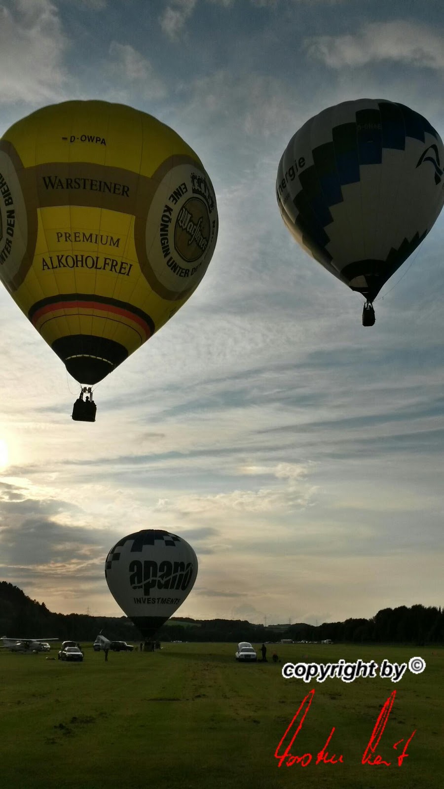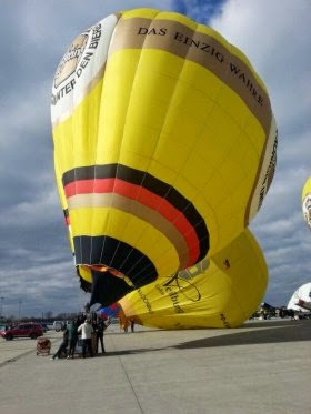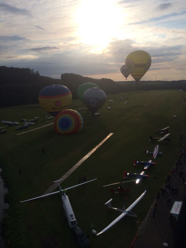 Neben den vielen Attraktionen, die der Luftsport bietet und dem Publikum bereits den ganzen Tag über geboten wurden, fand gegen Abend natürlich auch noch eine Ballonfahrt statt. Der BSCN war mit allen drei Ballonen dabei. Nach der Fahrt ging es schnell wieder zurück zum Flugplatz, um dort die Ballone erneut für ein Nightglow aufzustellen. |