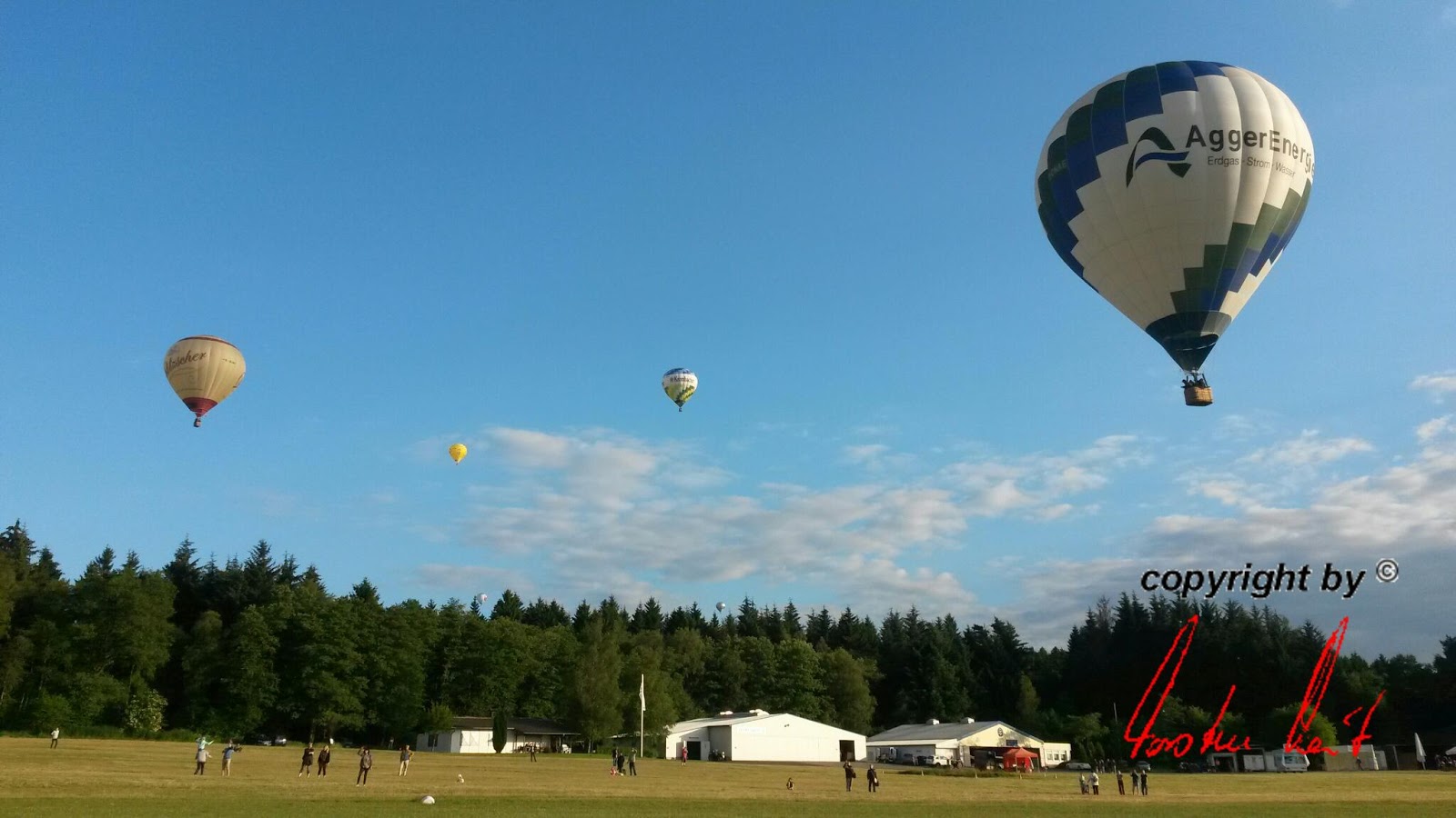 Wie bereits 2013 fand auch dieses Jahr wieder unter der Organisation der Ballonsportgruppe A.Li.Be.Bi. e.V. das Heißluftballon- und Drachenfestival statt. Zu dieser familiären Ballonsportveranstaltung wurden unter anderem auch der BSC Nümbrecht eingeladen. Dieser Einladung folgte unser Nachwuchspilot Martin Henn mit seinem Team gerne und präsentierte dort unseren Sponsorenballon AggerEnergie. Nachdem die Wetterprognosen sowohl für den Freitagabend als auch für den Samstagmorgen keine Starts zuließen, kam für Samstagabend endlich das „Go“. Bei perfekten Bedingungen konnten alle Ballone aufsteigen. Während sich einige Piloten für die tieferen Schichten Richtung Frankreich entschieden, wählten andere Piloten die hohen Lufträume, um genau in die entgegengesetzte Richtung zu fahren und sich anschließend in den tieferen Schichten wieder zurück in die Nähe des Startplatzes treiben zu lassen. So konnte den begeisterten Zuschauern nicht nur beim anschließenden Nightglow und den immer wieder gerne gesehenen Sonderformen gezeigt werden, was das Ballonfahren so einzigartig macht. |