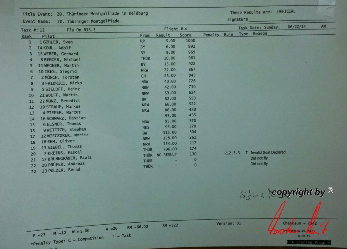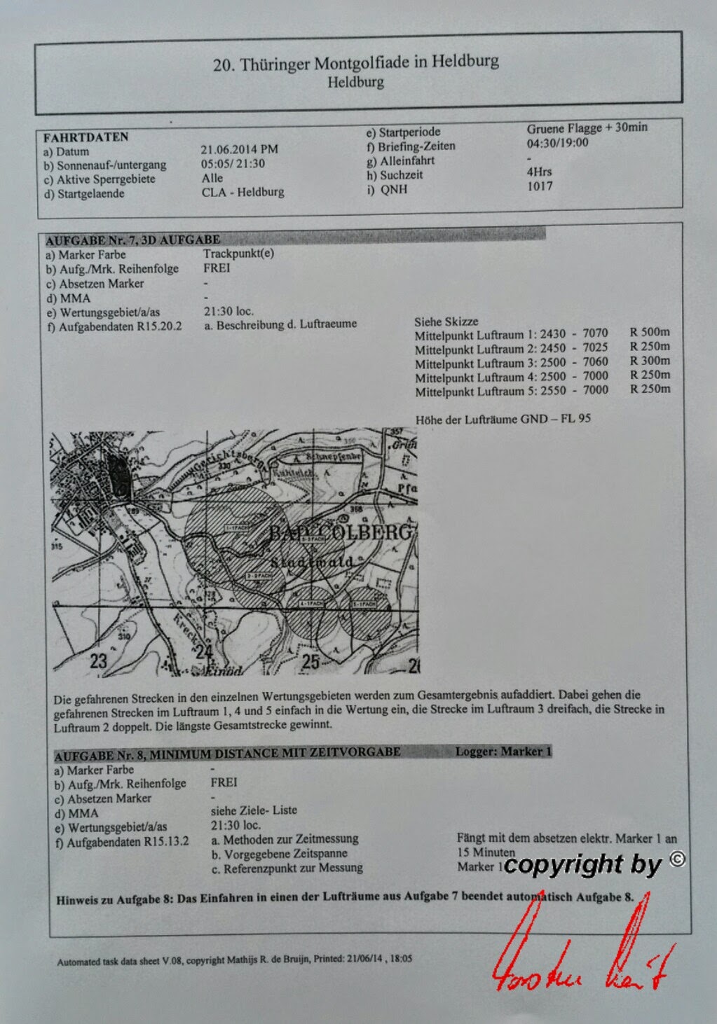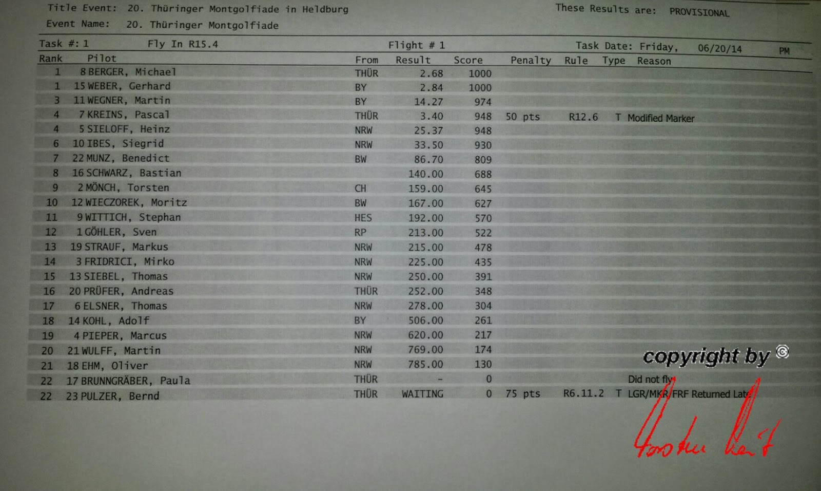 Freitag, 20. Juni 2014 / 1. Fahrt - Ergebnis Wunderbar, mit dem Ergebnis sind wir noch recht zufrieden. Eine Sekunde vor Ende der Wertungsperiode hat Marcus noch die Logger-Taste gedrückt und mit einem Abstand von 215 Metern zum Ziel immerhin noch 478 wertvolle Punkte holen können. |