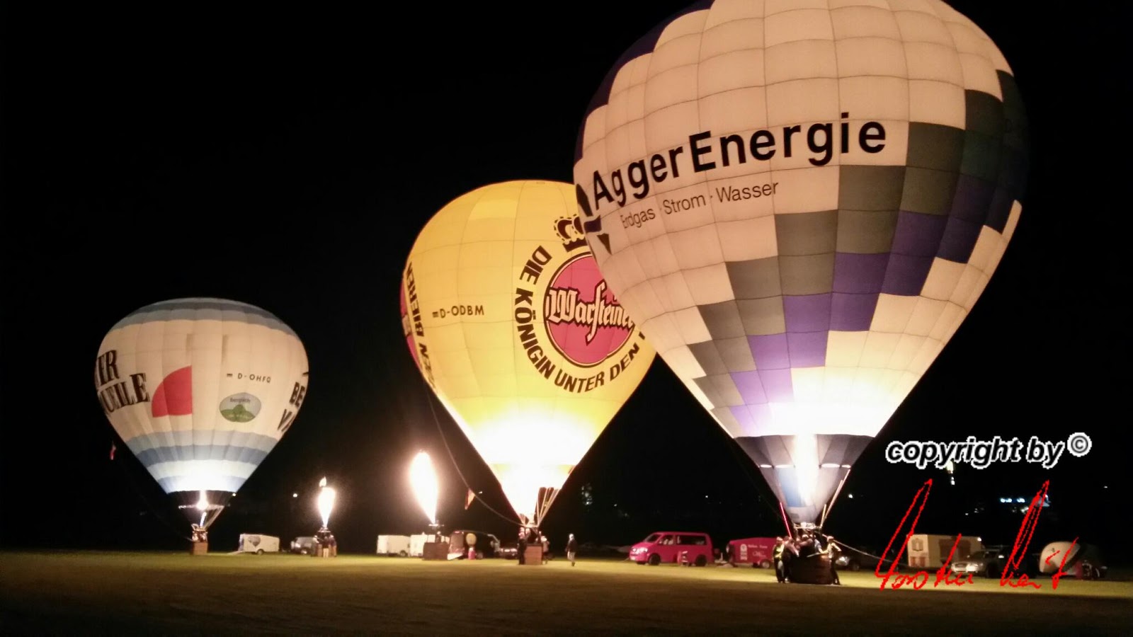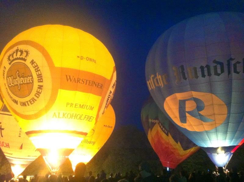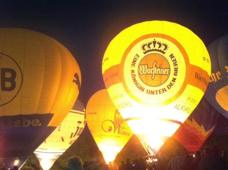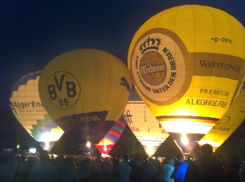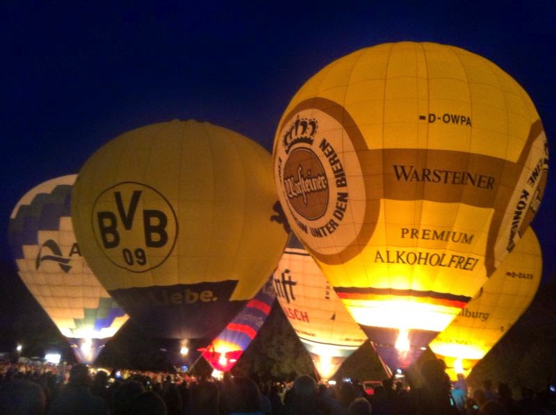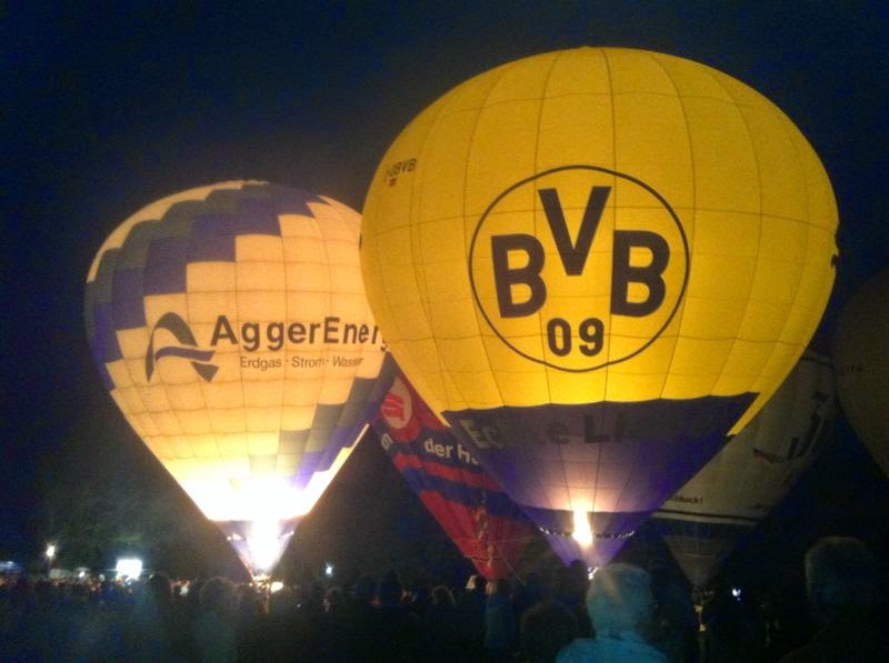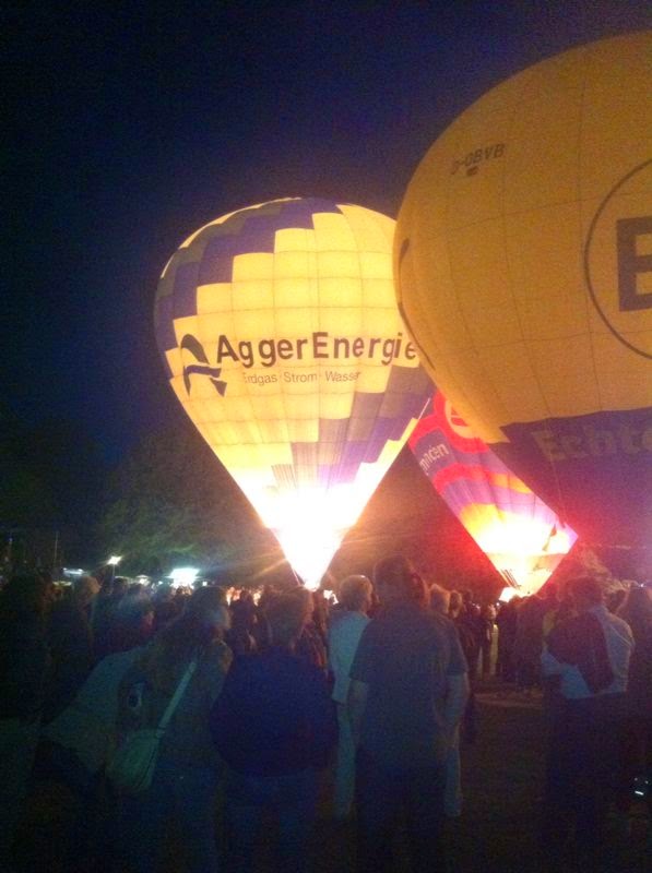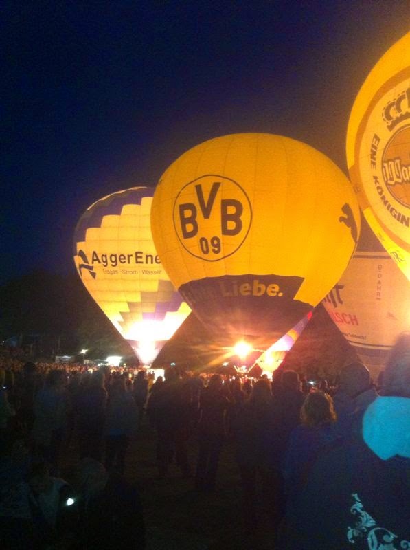 Das Wetter war mal wieder der große Unsicherheitsfaktor beim diesjährigen Lichterfest. Wir mussten mit dem Aufrüsten der Ballone aufgrund der starken Böen, die immer wieder rein kamen, bis ca. 22 Uhr warten - doch dann fiel die Entscheidung und die Ballone "AggerEnergie", "Warsteiner Alkoholfrei" und "Weilburg, Perle an der Lahn" des Ballonsport-Club Nümbrechts sowie die Ballone unserer befreundeten Piloten mit dem "BVB, echt Liebe", "Firefly", "Zunft", "Sparkasse der Homburgischen Gemeinden" und "Kölnische Rundschau / Sparkasse" wurden innerhalb kürzester Zeit aufgerüstet. Um 22:20 Uhr konnte dann das vom Publikum sehnsüchtig erwartete Nightglow beginnen. |