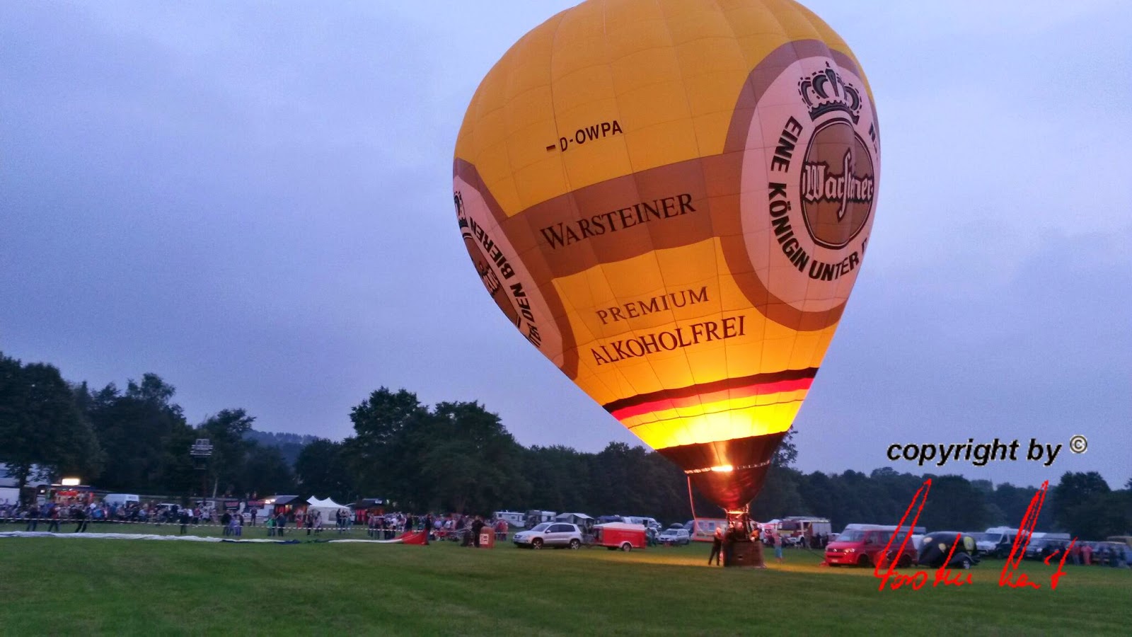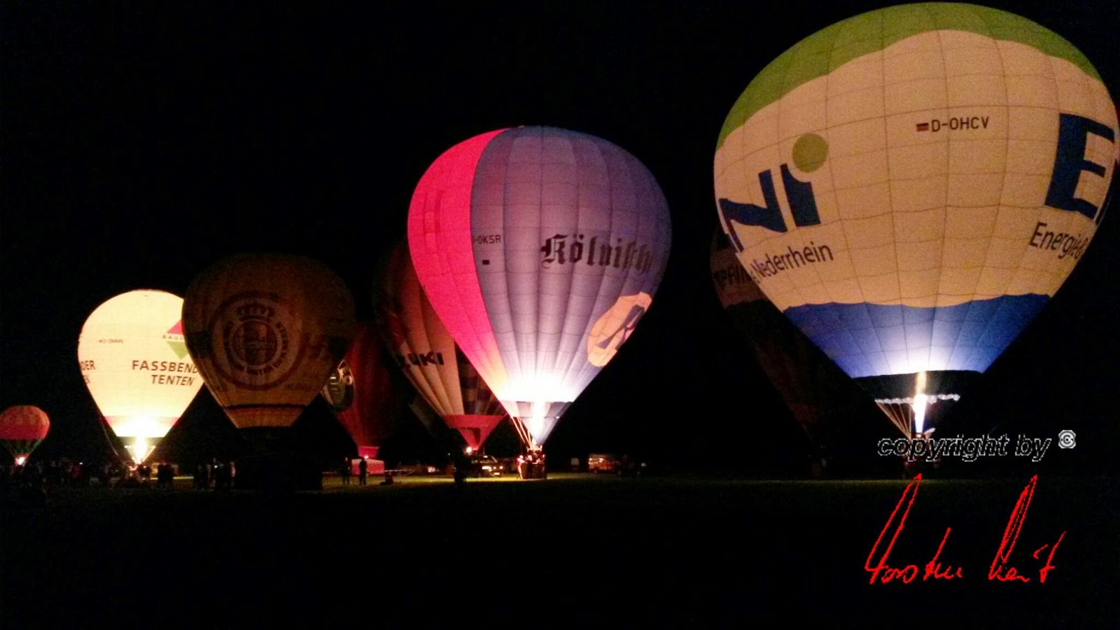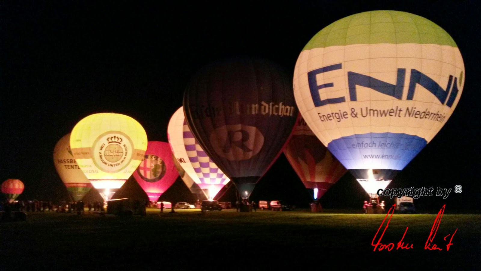 Das Wetter war mal wieder der große Unsicherheitsfaktor beim diesjährigen Lichterfest. Wir mussten mit dem Aufrüsten der Ballone aufgrund der starken Böen, die immer wieder rein kamen, bis ca. 22 Uhr warten - doch dann fiel die Entscheidung und die Ballone "AggerEnergie", "Warsteiner Alkoholfrei" und "Weilburg, Perle an der Lahn" des Ballonsport-Club Nümbrechts sowie die Ballone unserer befreundeten Piloten mit dem "BVB, echt Liebe", "Firefly", "Zunft", "Sparkasse der Homburgischen Gemeinden" und "Kölnische Rundschau / Sparkasse" wurden innerhalb kürzester Zeit aufgerüstet. Um 22:20 Uhr konnte dann das vom Publikum sehnsüchtig erwartete Nightglow beginnen. |
