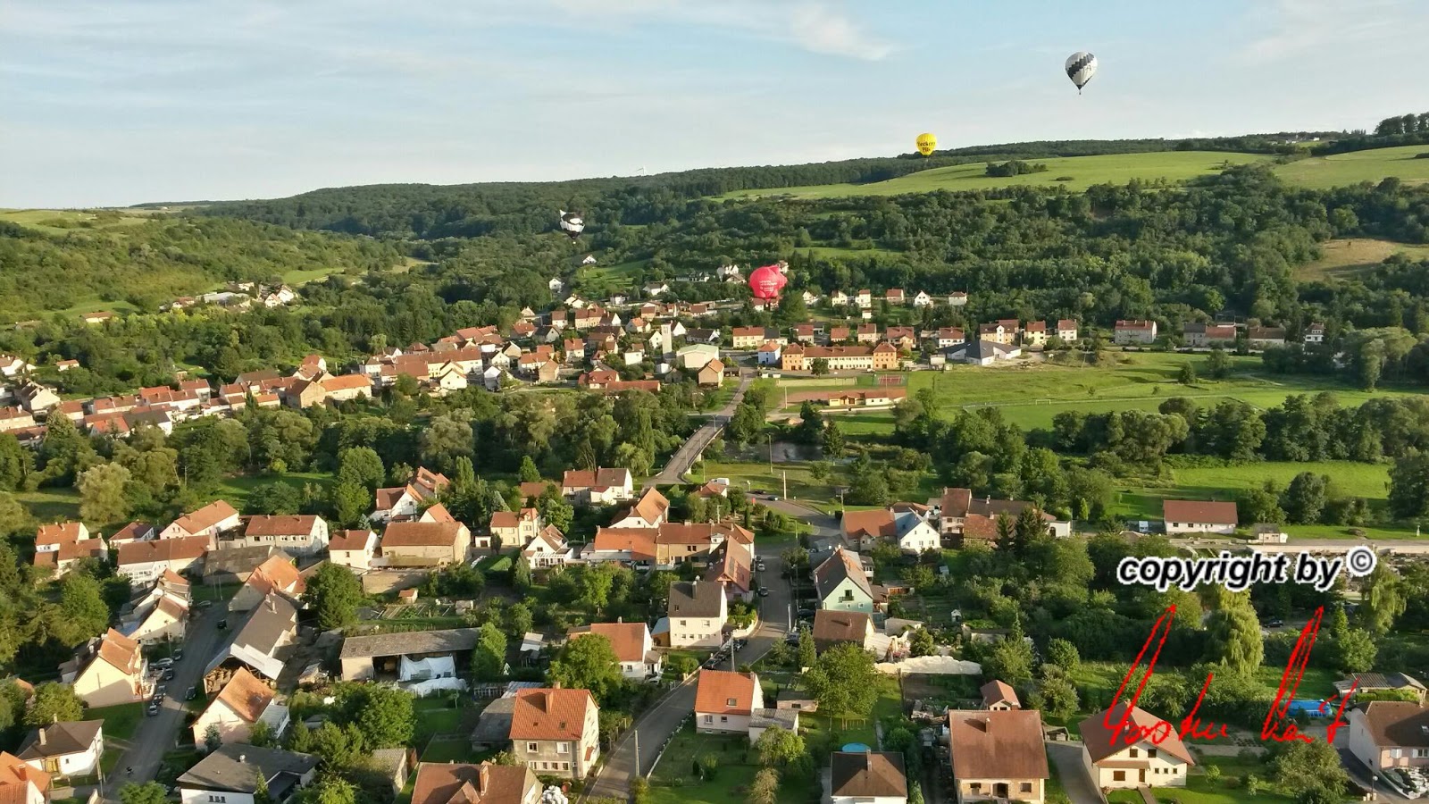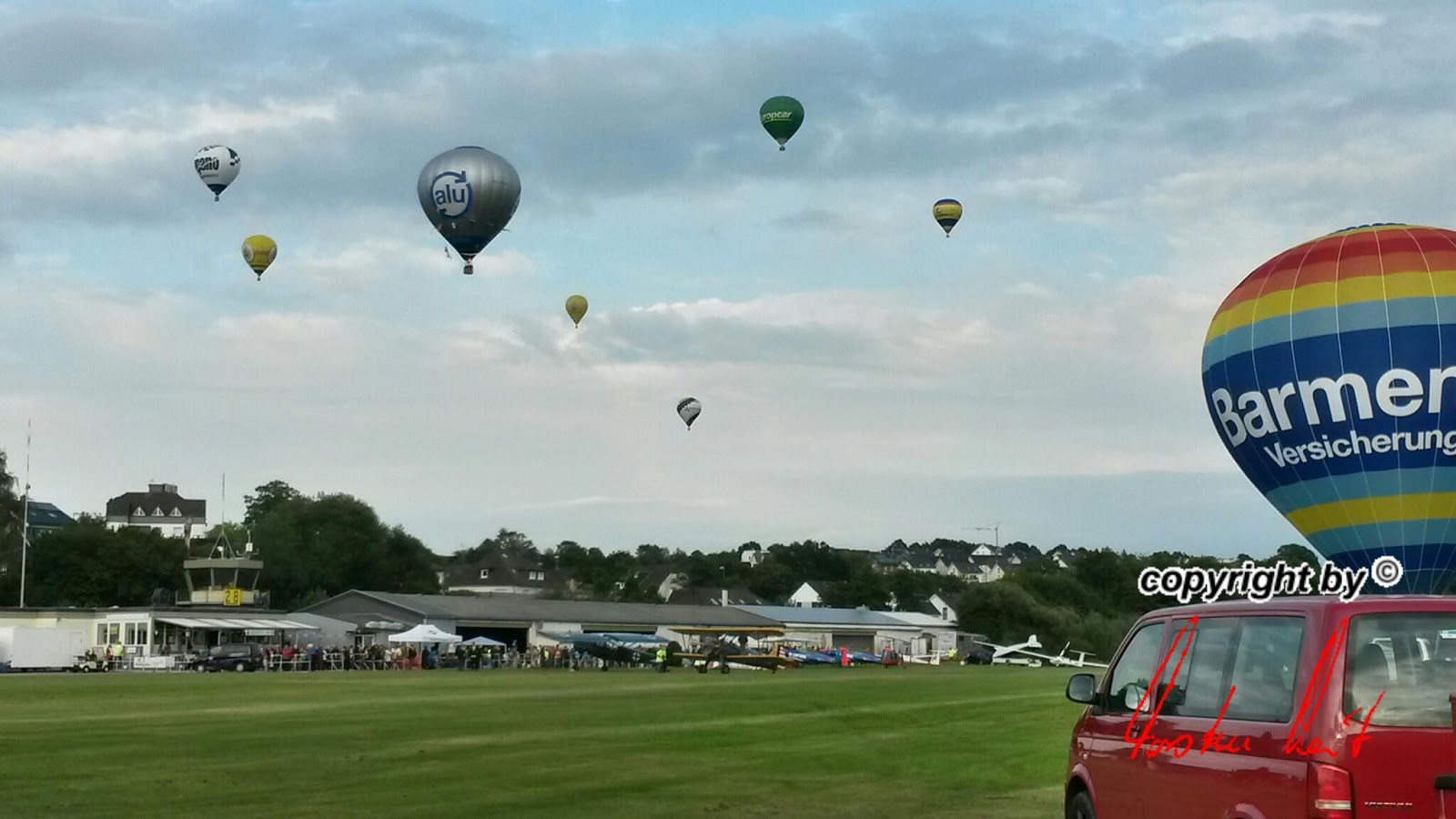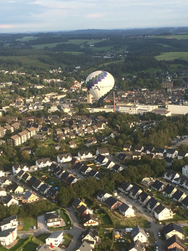 Anlässlich des Flugplatzfestes in Hünsborn sind wir am Sonntag, den 15. Juni bei herrlichem Wetter mit unsrem AggerEnergie-Ballon zusammen mit 7 weiteren Ballonen gestartet. Die Fahrt ging bis nach Mörsbach im Westerwald. |